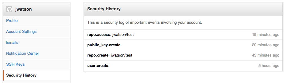 We’ve had detailed audit logs that we use from GitHub.com for quite some time now. After a lot of work, this same audit logging system is now available in Enterprise. This means that Security History for users and repositories is now available: